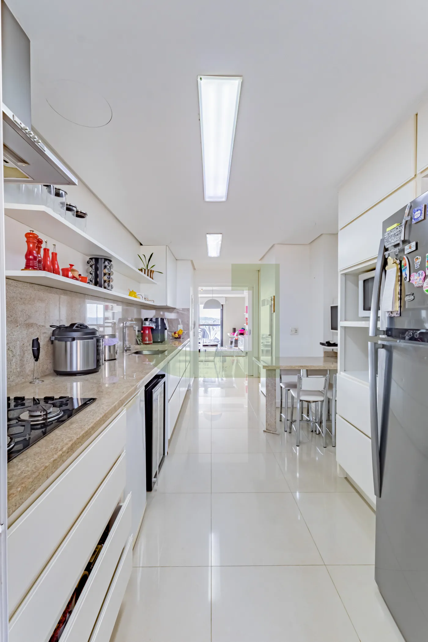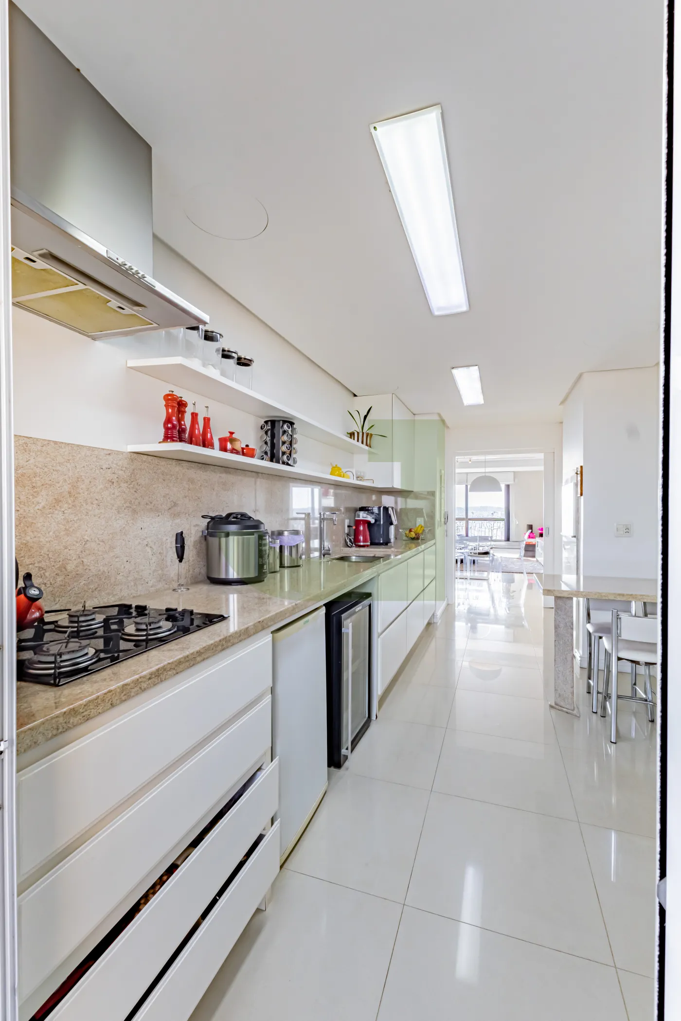 A área social possui sala de estar e jantar integradas, oferecendo um ambiente perfeito para receber amigos e familiares. A cozinha é funcional e equipada, trazendo mais praticidade para o dia a dia.