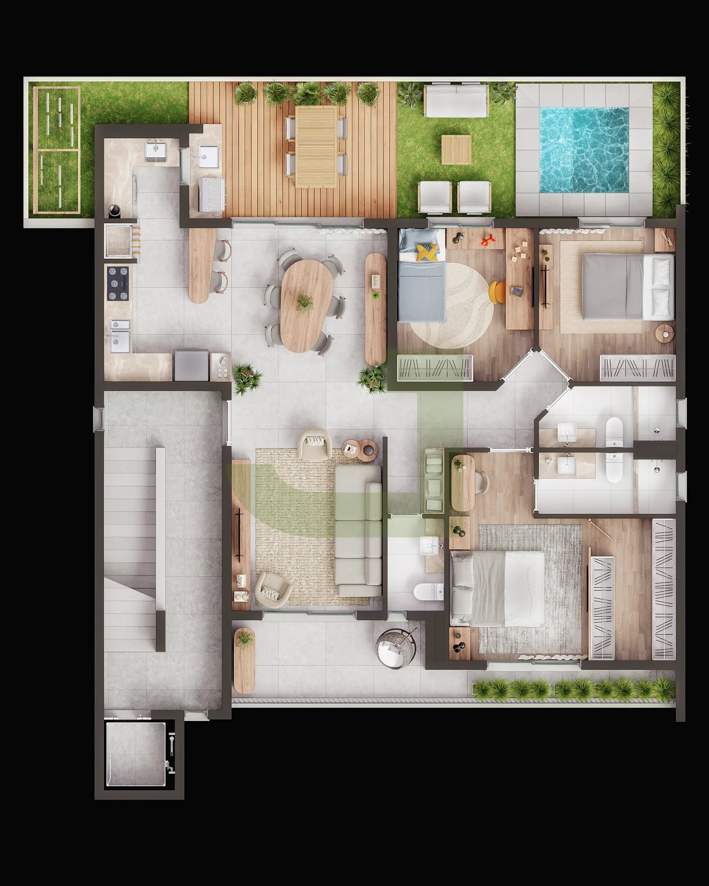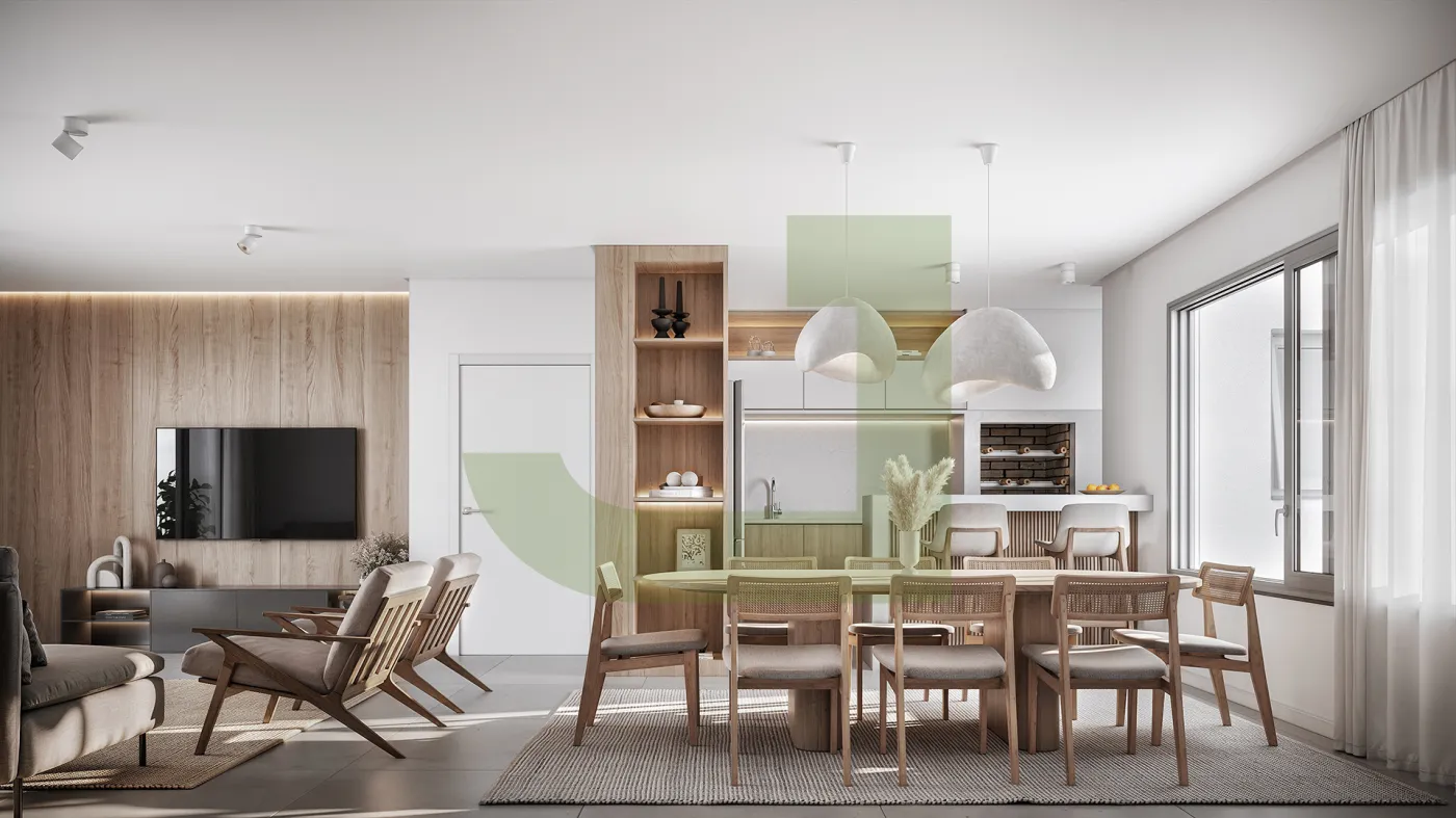 O apartamento Aconchego com 215,18m² possui três dormitórios, sendo um suíte, cozinha integrada, lavabo, churrasqueira externa, área de serviço, sacada, garagem coberta para até 4 carros compactos. Podendo optar por terraço ou pátio privativo