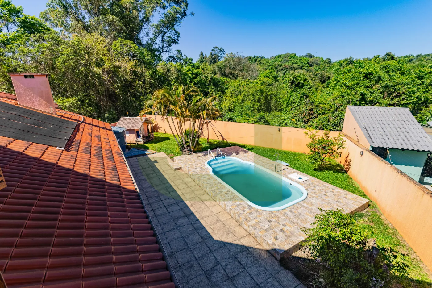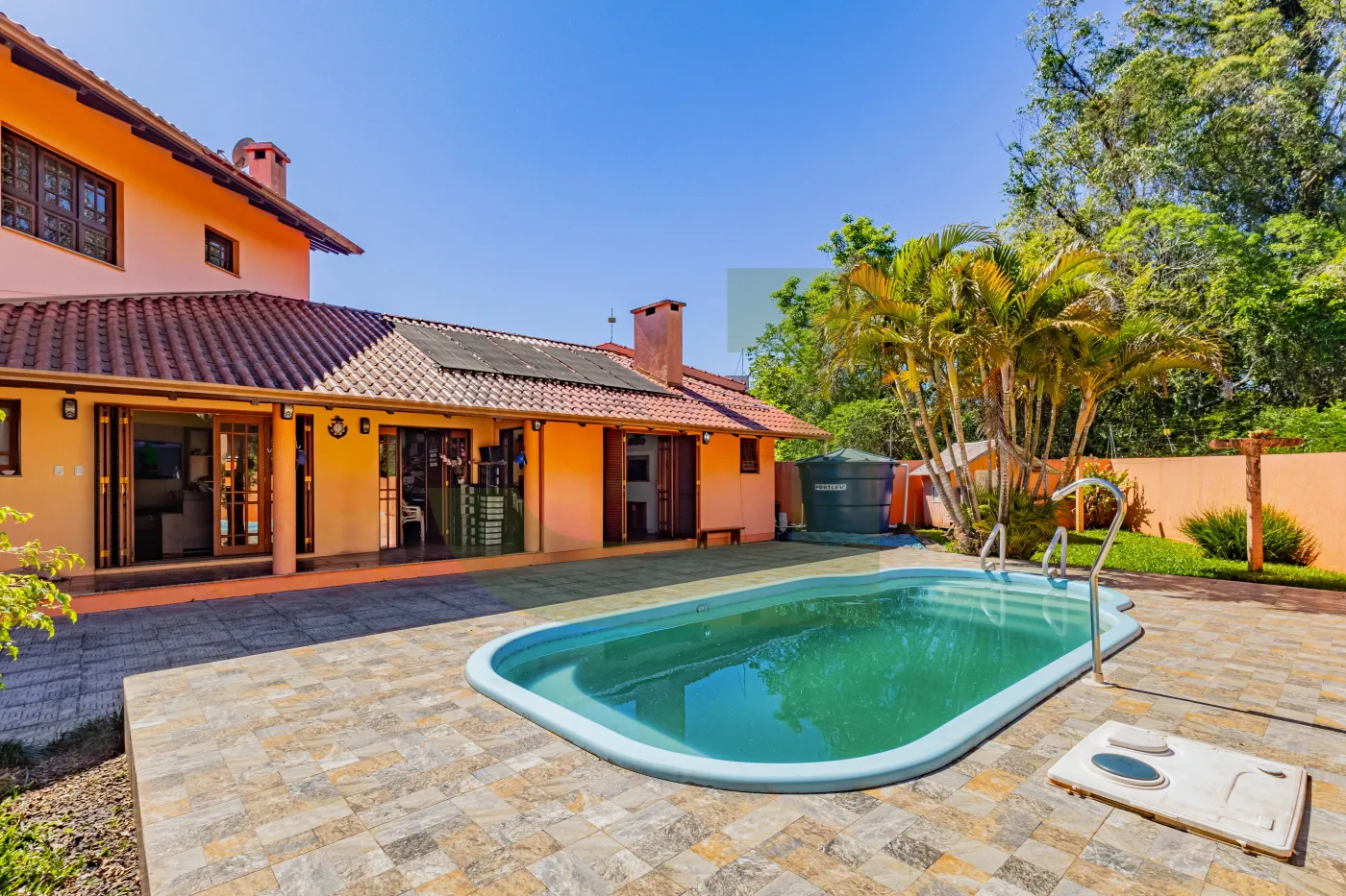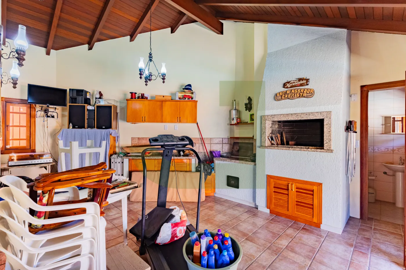 Nos fundos, um charmoso espaço gourmet com banheiro de apoio à churrasqueira, ateliê e pátio com piscina, perfeitos para momentos de lazer e convivência em família.