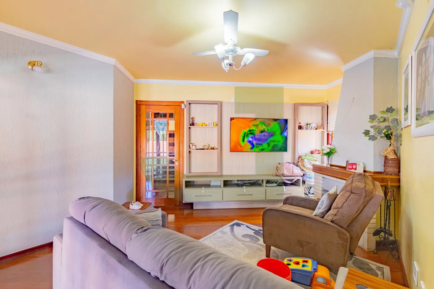 As áreas sociais são integradas e acolhedoras, com sala de estar e jantar, sala de TV com lareira e estante sob medida, além de cozinha funcional. No piso inferior, há armários embutidos no corredor, assim como no andar superior, oferecendo excelente aproveitamento de espaço.