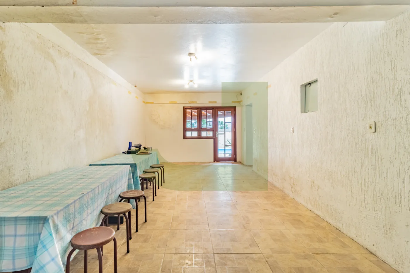 Subsolo: Salas, banheiro, pátio com piscina, quiosque com churrasqueira e lavanderia
