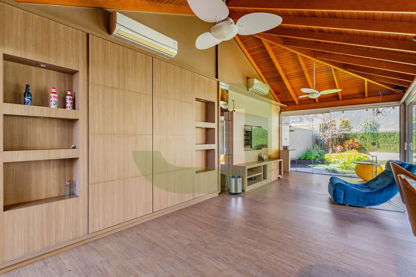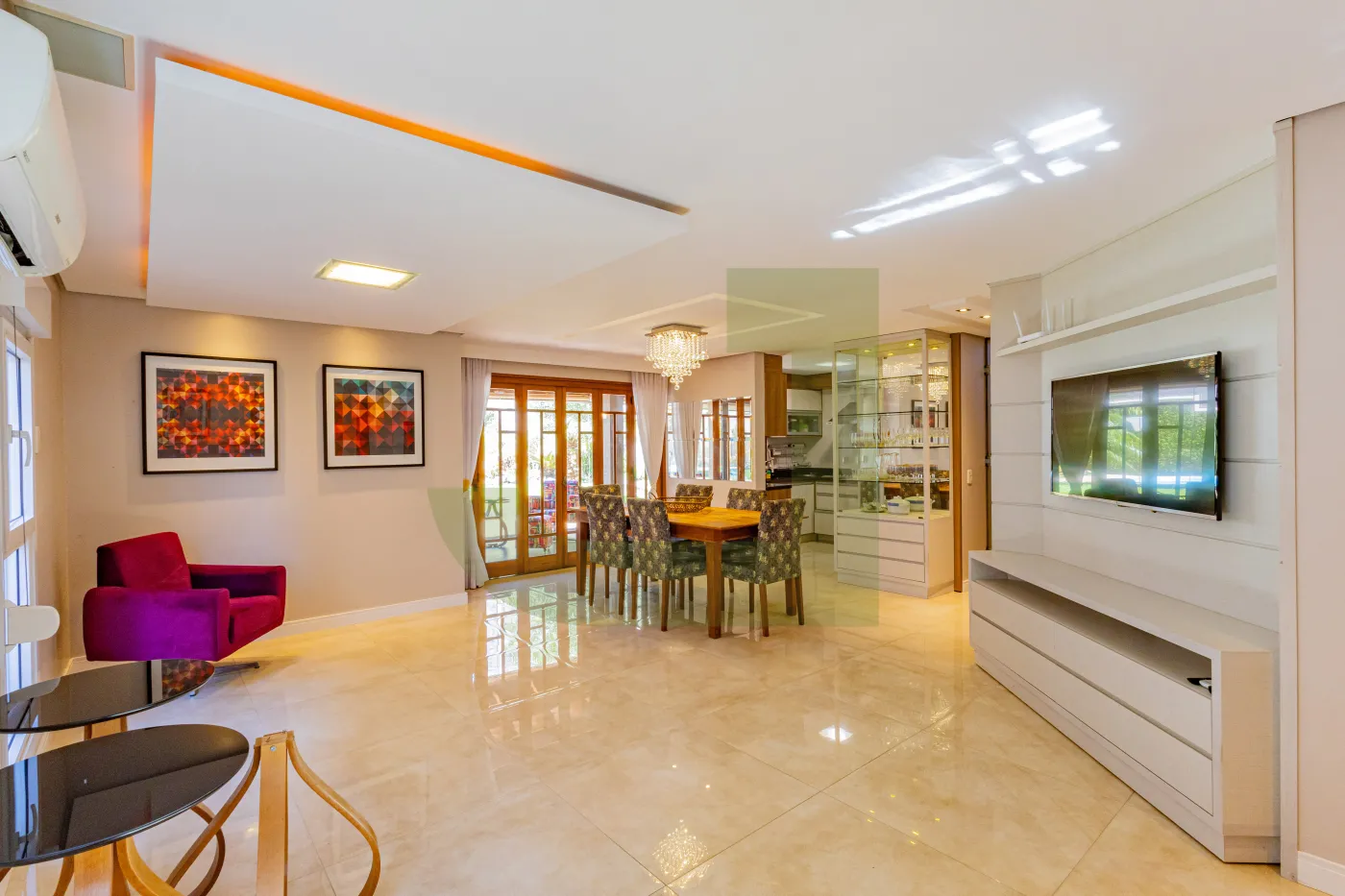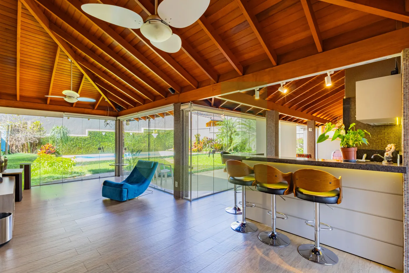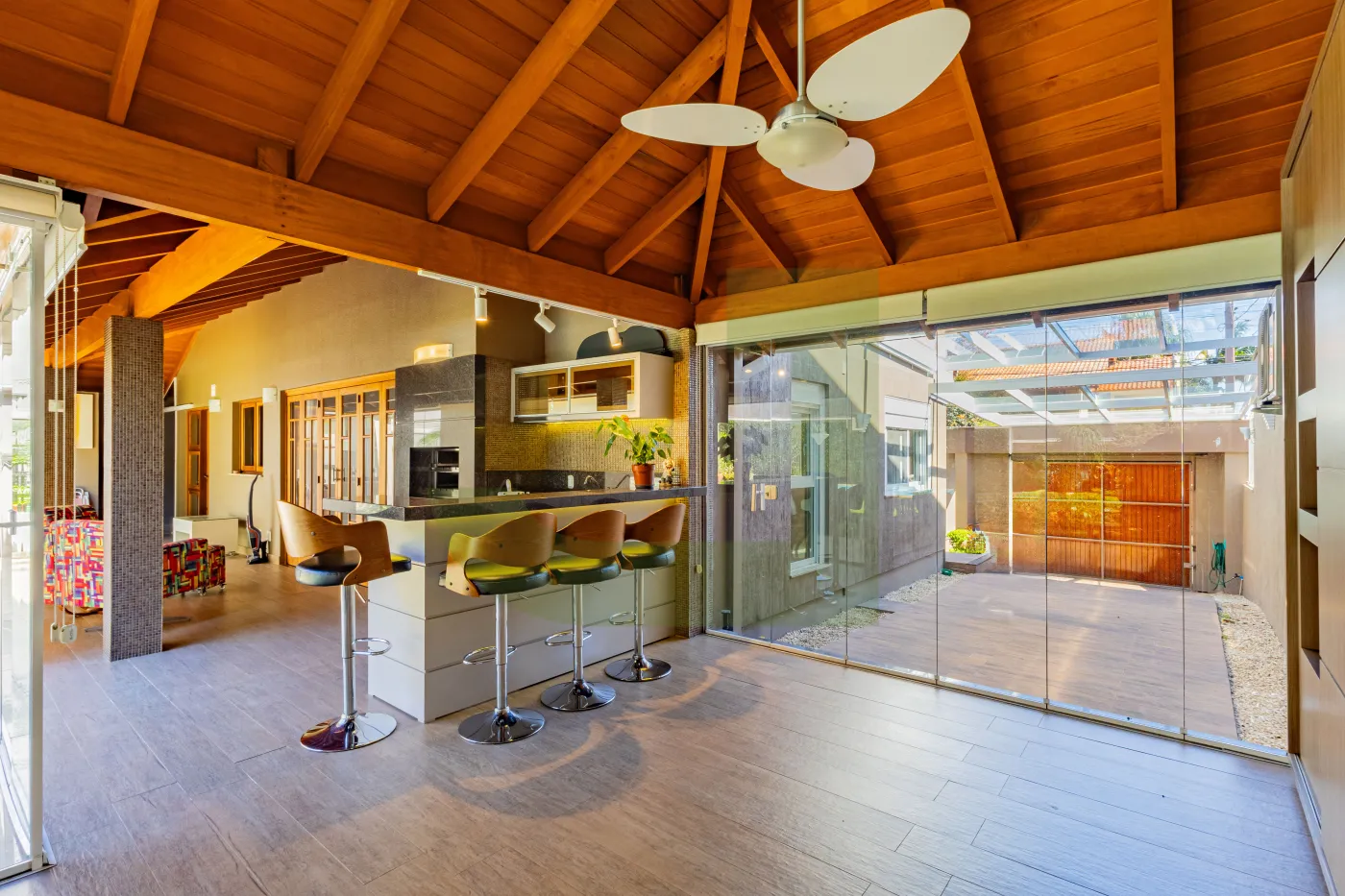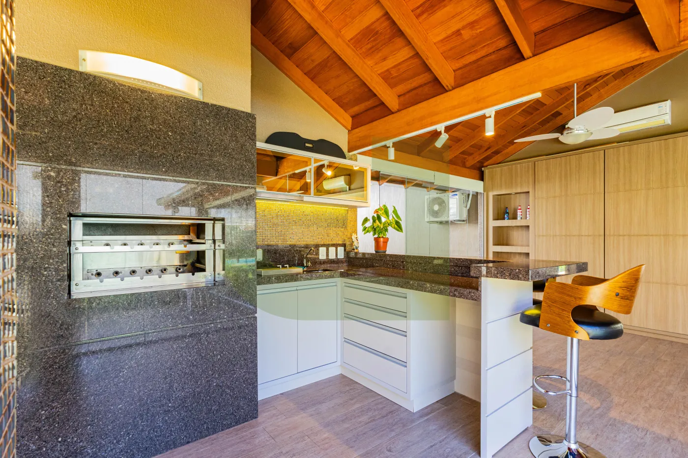Minha varanda com churrasqueira é perfeita pra reunir a família. E ainda tem um estar climatizado com TV integrado que fica aconchegante o ano inteiro!