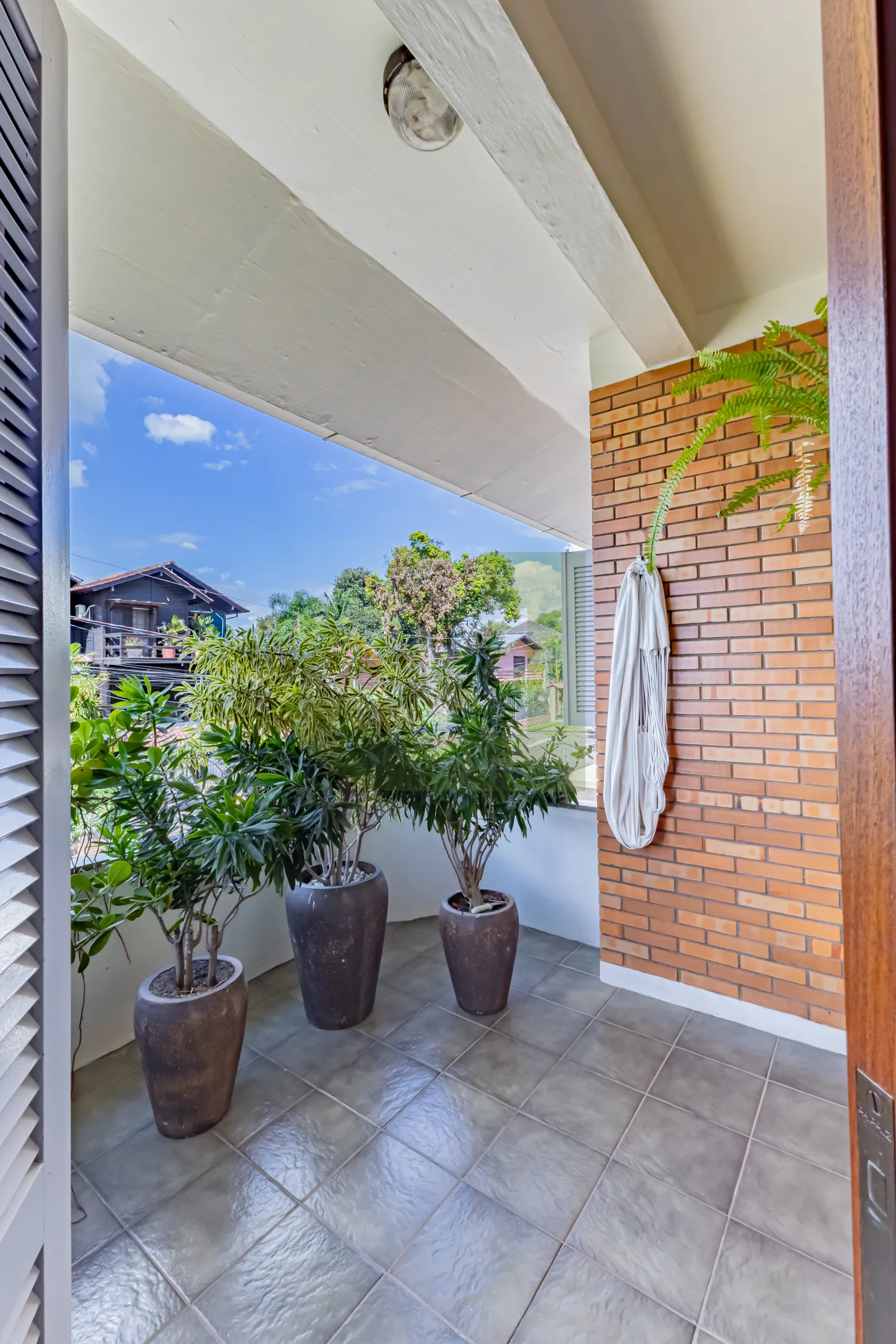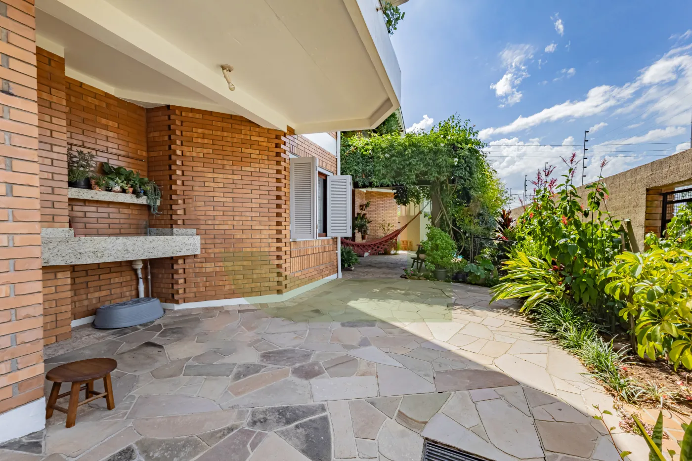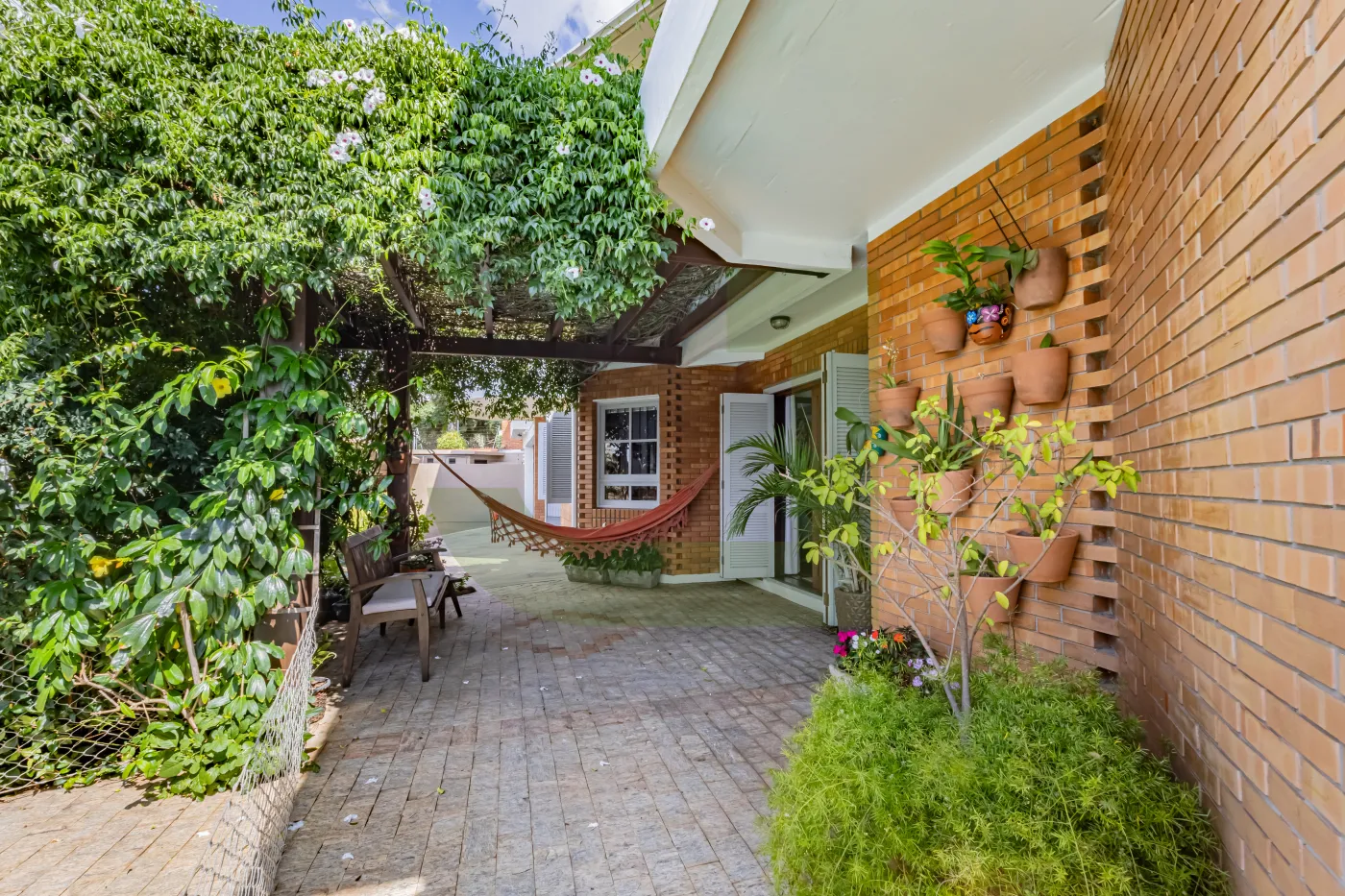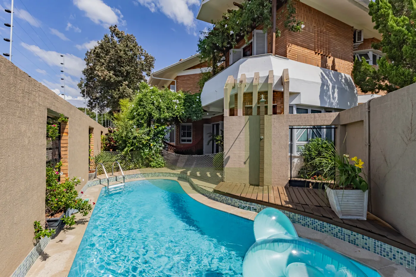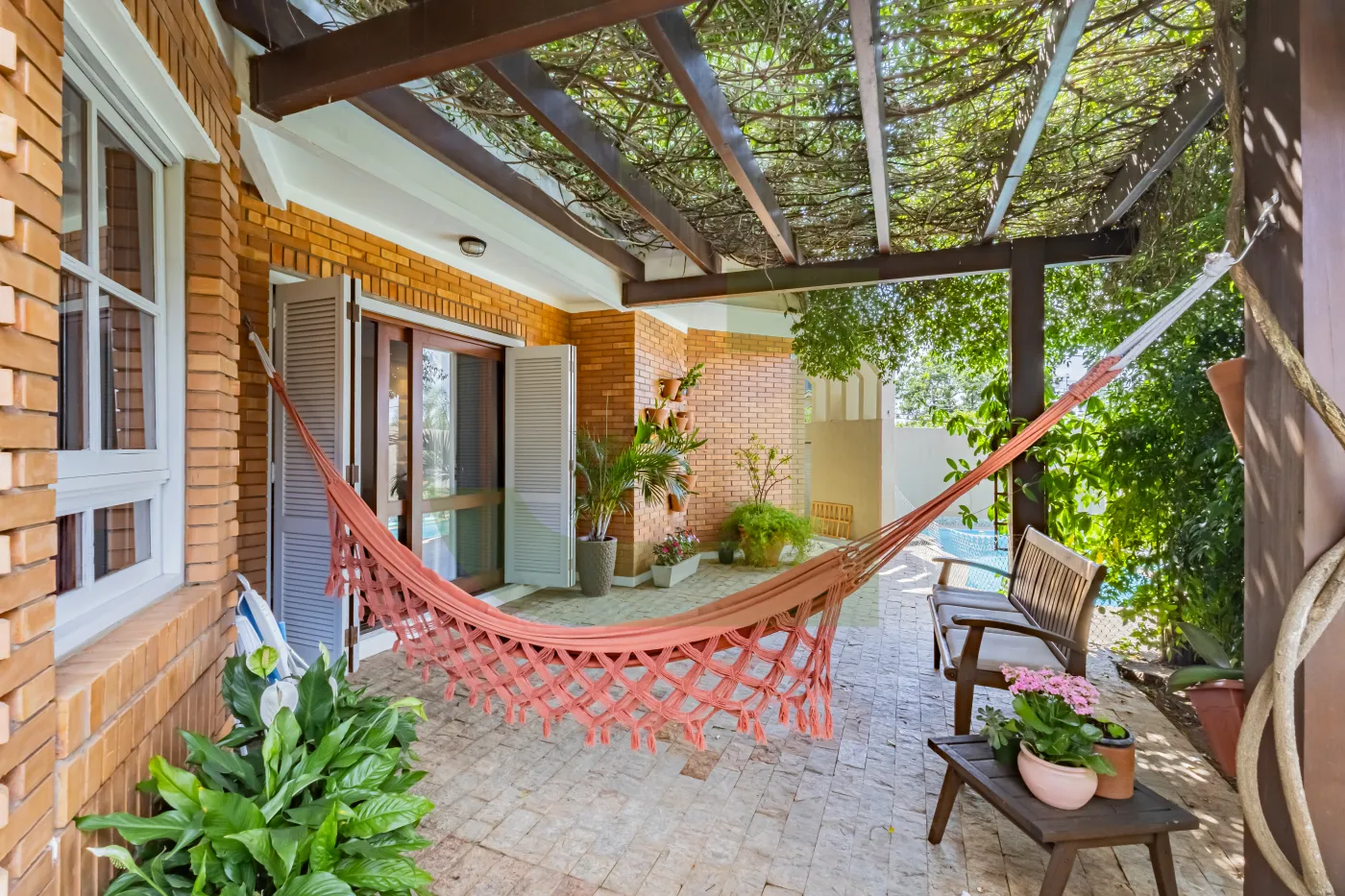 Na área externa, um verdadeiro refúgio: piscina e um espaço zen com cadeira de balanço, cercado por um belo ambiente arborizado, um convite para relaxar e aproveitar a natureza.