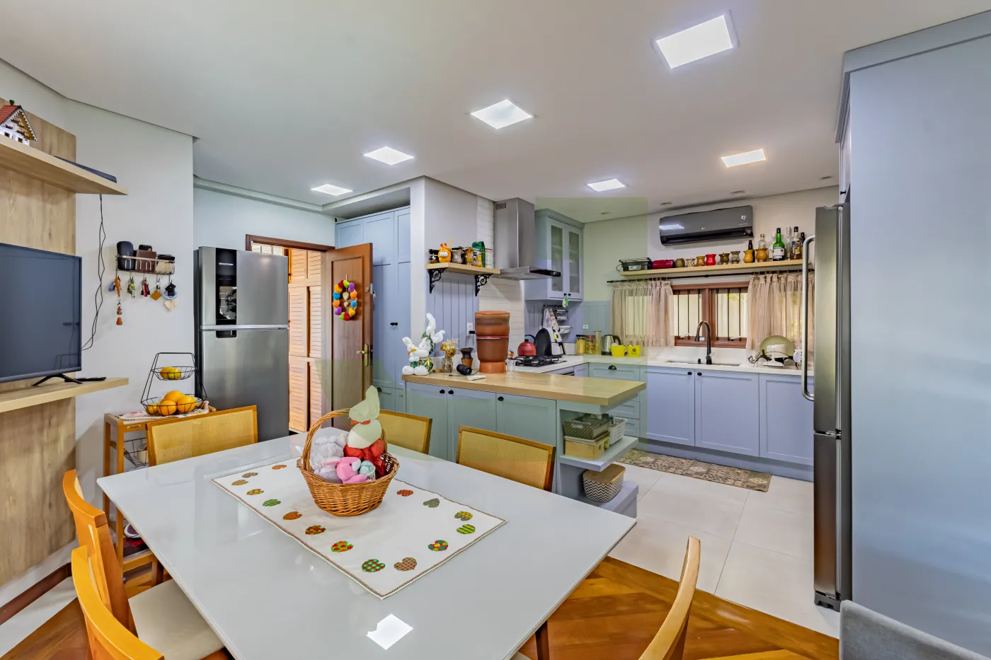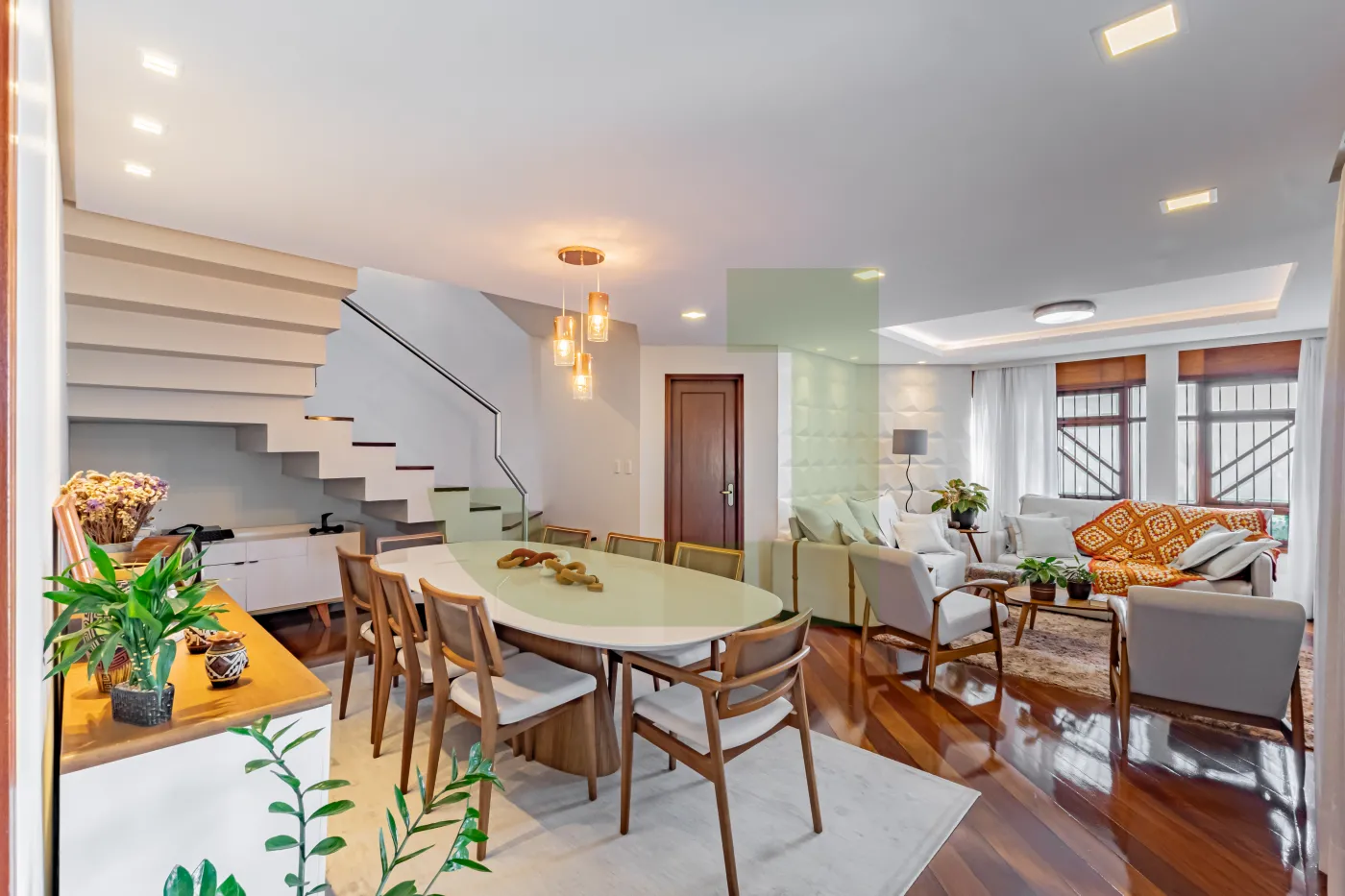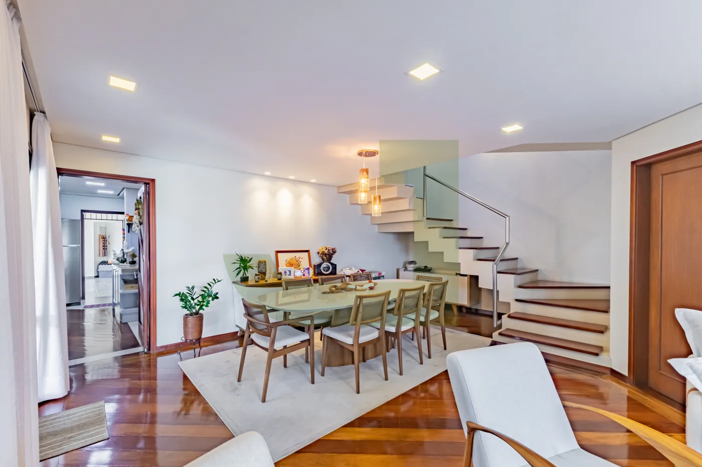 No primeiro pavimento, a casa dispõe de sala de estar, sala de jantar, cozinha separada com split, despensa e lavanderia. A ampla garagem com churrasqueira é ideal para receber amigos e familiares, com espaço para 2 carros cobertos e mais 2 vagas descobertas.